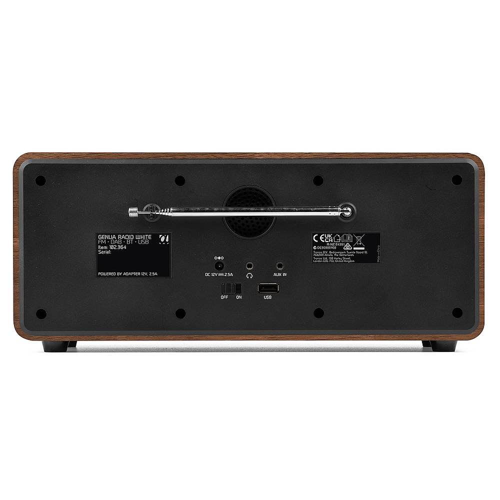 <p>La radio Genua DAB+ è un elegante sistema audio stereo digitale, alloggiato in un alloggiamento moderno, adatto a qualsiasi casa o ufficio. Basta collegare la radio alla rete elettrica per goderti immediatamente un'ampia selezione di stazioni radio tramite la radio digitale DAB+ o quando sei fuori dall'area di trasmissione digitale con la radio FM convenzionale. La Genua Digital Radio è dotata anche di un ampio display LCD a colori che mostra la stazione radio selezionata, nonché la programmazione attuale, le notizie e le informazioni meteo, se abilitate dall'emittente. Con la tecnologia wireless BT, riproduci la musica direttamente dal tuo smartphone, tablet o PC. Il Genua dispone anche di timer di spegnimento e di cucina.</p><ul><li>Radio DAB+/FM multifunzionale</li><li>Qualità del suono stereo superiore</li><li>Ricevitore BT per lo streaming audio</li><li>Ampio display TFT a colori da 2,8 pollici</li><li>Funzione dimming</li><li>Radio DAB/FM (30 + 30 preimpostazioni)</li><li>Funzione di scansione automatica</li><li>Orologio/Timer di spegnimento</li><li>Doppia funzione di allarme</li><li>Uscita per cuffie da 3,5 mm</li><li>Ingresso ausiliario da 3,5 mm</li><li>Incluso telecomando</li></ul><ul><li>Product colour Brown, White</li><li>Playback options BT streaming, USB, FM radio, DAB+ radio, Line input</li><li>Input connections 3.5mm Jack, USB</li><li>Output connections 3.5mm Jack</li><li>Output power 50W</li><li>Power supply 100-240VAC 50/60Hz (12V Adapter)</li><li>Dimensions (L x W x H) 135 x 310 x 133mm</li><li>Weight (kg) 1,55</li></ul>