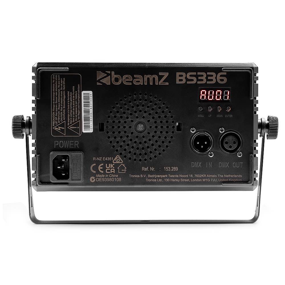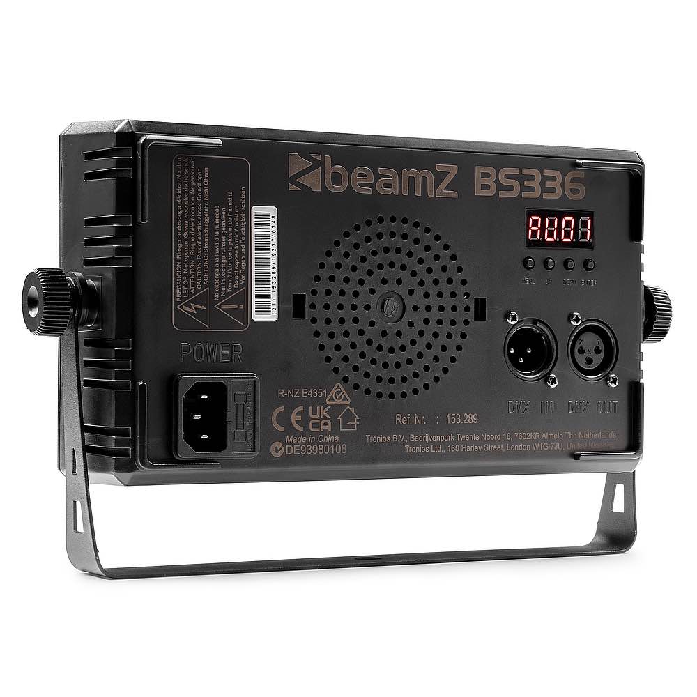 <p>Il BS336 è un apparecchio multiuso ed è appositamente progettato per essere utilizzato come flash, grazie ai 336 LED SMD. Il pannello LED è diviso in diverse sezioni e può lampeggiare in qualsiasi colore desideri grazie al suo sistema di miscelazione RGB. Questo apparecchio è inoltre dotato di una striscia di 56 LED SMD bianchi al centro dell'apparecchio, controllabili in diverse sezioni per creare l'aspetto tradizionale di uno stroboscopio. Il BS336 consente di creare effetti colorati unici e il controllo è semplice tramite DMX o in modalità stand-alone con funzione automatica. Adatto a tutti i tipi di spettacoli ed eventi.</p><ul><li>Stroboscopio, Blinder e Wash</li><li>280 LED SMD RGB</li><li>56 LED SMD bianchi</li><li>Miscelazione dei colori RGB + bianco freddo</li><li>Controllabile in 12 segmenti (8 zone RGB e 4 zone LED bianche)</li><li>DMX512, stand alone e modalità Master/slave</li><li>Attivazione sonora con sensibilità regolabile</li><li>Programmi automatici e spettacoli pre-programmati</li><li>Velocità regolabile 1-15</li><li>Alloggiamento in ABS raffreddato a ventola</li><li>Varie curve dimmer regolabili</li><li>Ingresso IEC connettore</li><li>Telecomando senza fili</li></ul><ul><li>Product colour Black</li><li>Light source Single colour LED, 3-in-1 LED</li><li>Colours Red, Green, Blue, White</li><li>Quantity of LEDs 336</li><li>Quantity of strobe LEDs 56</li><li>Beam angle 60°</li><li>Field angle 112°</li><li>Illuminance 2.126 lx @ 0.5m</li><li>IP rating IP20</li><li>DMX channels 4, 6, 12, 24, 30</li><li>DMX connection 3-pin XLR</li><li>Flash rate per second 1 - 20Hz</li><li>Display LED</li><li>Modes Automatic programs, DMX, Master/Slave</li><li>Power consumption 0.425 - 0.262A</li><li>Power supply 100-240VAC 50/60Hz</li><li>Included accessories Remote control (wireless), Mounting bracket</li><li>Dimensions (L x W x H) 265 x 160 x 65mm</li><li>Weight (kg) 0,95</li></ul>