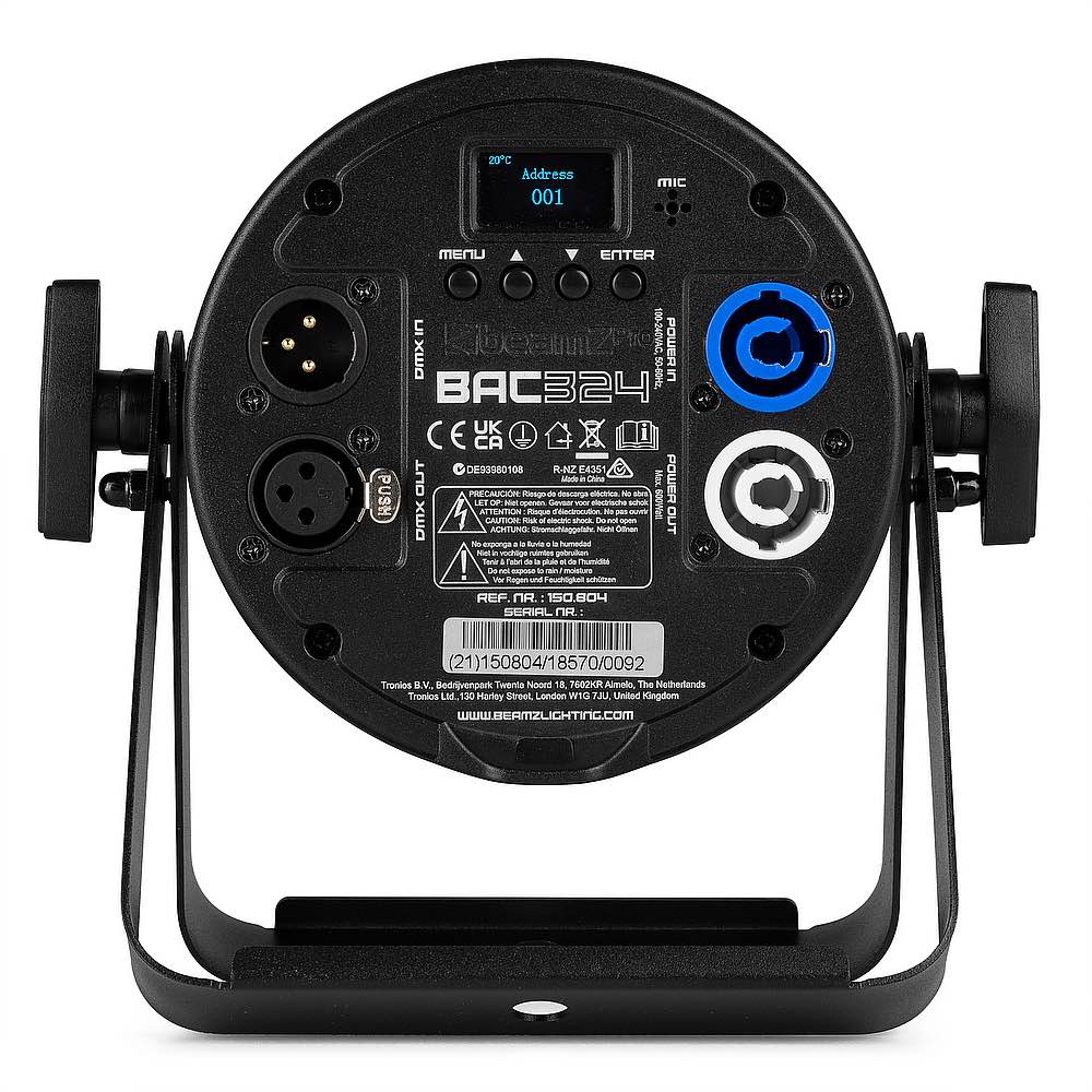 <p>La serie beamZ BAC3 è una serie di LED ProPars compatti in alluminio, sviluppati secondo la più recente tecnologia LED. La combinazione di LED ad alta potenza integrati in un attraente alloggiamento in alluminio pressofuso garantisce una dissipazione del calore altamente efficiente. Ciò elimina la necessità di una ventola interna, rendendo questo Par assolutamente silenzioso durante il funzionamento. Il display OLED con menu LED a 4 pulsanti consente un facile accesso alle funzioni tra cui DMX, master/slave, attivazione del suono e funzione stand alone. Dotato di connettori ingresso/uscita P-Con e XLR a 3 pin ingresso/uscita per collegare a margherita più unità insieme. Magnete anteriore per accessori opzionali: filtro 40° (150.812), Barndoor (150.813)</p><ul><li>PAR leggero in alluminio con 6 LED 6 in 1 da 10 W</li><li>Miscelazione colori RGBWA-UV (rosso/verde/blu/bianco/ambra/UV)</li><li>6, 8, 10 o 11 canali DMX</li><li>Modalità DMX e Stand-alone</li><li>Dimmer elettronico 0-100%.</li><li>Funzione Master/Slave</li><li>Controllo remoto IR</li><li>Ingresso/uscita DMX tramite XLR a 3 pin</li><li>Show preprogrammati</li><li>Attivazione sonora con sensibilità regolabile</li><li>Modalità automatica con velocità regolabile</li><li>Pannello di controllo con display OLED</li><li>Ingresso/uscita connettore P-Con</li><li>Colore: nero</li></ul><ul><li>Product colour Black</li><li>Light source 6-in-1 LED</li><li>Colours Red, Green, Blue, Amber, White, Ultra Violet</li><li>LED power (single LED) 10W</li><li>Quantity of LEDs 6</li><li>Beam angle 20°</li><li>Field angle 45°</li><li>Flash rate per second 0 - 15Hz</li><li>DMX channels 6, 8, 10, 11</li><li>DMX connection 3-pin XLR</li><li>Modes Automatic programs, DMX</li><li>IP rating IP20</li><li>Cooling Convection</li><li>Display oLed</li><li>Power plug P-Con</li><li>Power supply 100-240VAC 50/60Hz</li><li>Dimensions (L x W x H) 130 x 130 x 100mm</li><li>Weight (kg) 1,60</li><li>Included accessories Remote control (wireless), Mounting bracket, Power cable</li></ul>