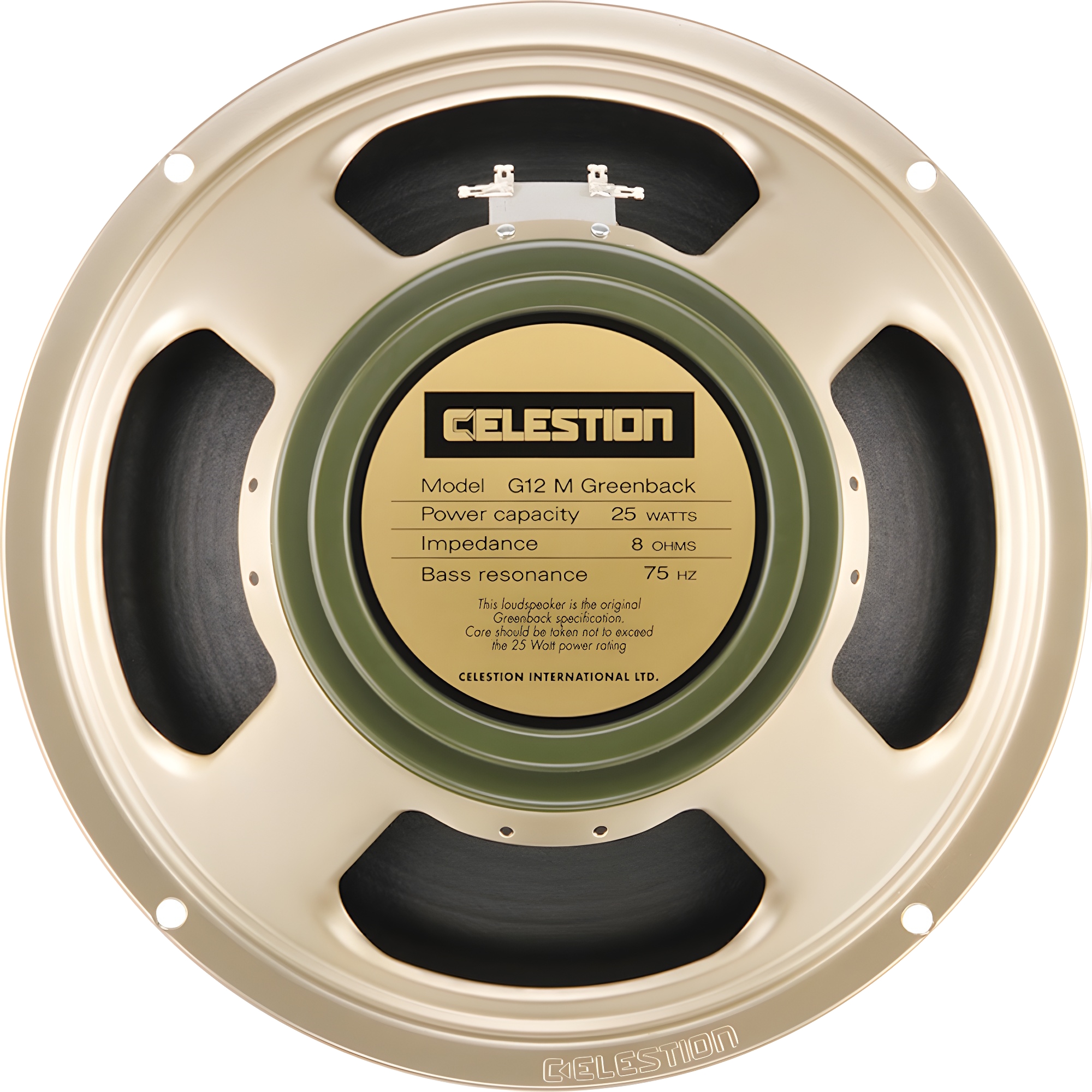 Celestion G12M Greenback è uno speaker per chitarra con magnete ceramico. Diametro 12", potenza nominale 25 Watt, impedenza 16 Ohm, bobina da 1.75" e sensibilità 98 dB.