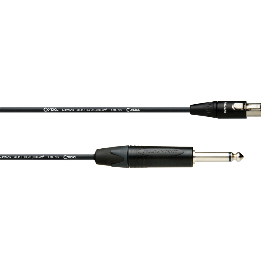 Cavo non bilanciato con un connettore jack TS da 1/4" Neutrik e un connettore mini XLR/F Rean della lunghezza di 1 metro, di colore nero.