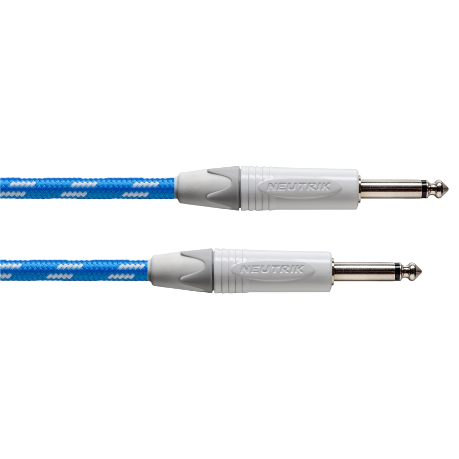 Cavo con 2 connettori jack TS da 1/4" Neutrik, lungo 3 metri, rivestito in tessuto blu e bianco.