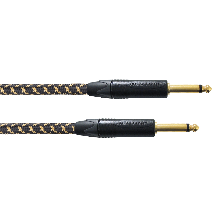 Cavo per strumenti musicali sbilanciato con 2 connettori jack TS da 1/4" Neutrik maschi. Il cavo è lungo 3 metri ed è rivestito di tessuto nero e oro. Il cavo utilizzato da Cordial per la realizzazione di questo prodotto è il CGK 150 che ha una superficie di conduzione di 0,50mm².
