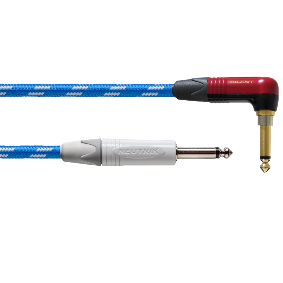 Cavo con un connettore jack TS da 1/4" Neutrik e un connettore jack TS Silent angolato da 1/4" Neutrik, lungo 6 metri, rivestito in tessuto blu e bianco.