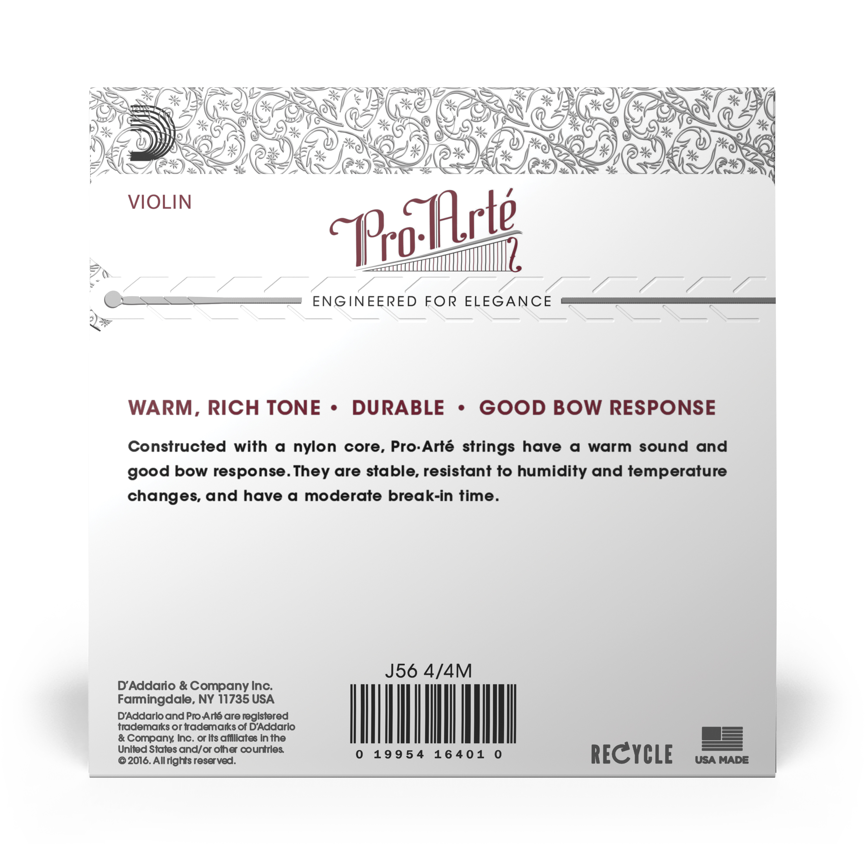 SET DI CORDE D'ADDARIO PRO-ARTE PER VIOLINO, SCALA 4/4, TENSIONE MEDIA L'anima sintetica delle corde Pro-Artà si distingue per un suono caldo e morbido. Le corde sono meno suscettibili ai cambi di temperatura e umidità, e si assestano velocemente. Le corde Pro-Arte sono progettate per lavorare a una tensione minore, in modo da ottimizzare la risposta alle sollecitazioni dell'archetto, il timbro complessivo e la suonabilità. La scelta perfetta per coloro alla ricerca di un timbro caldo e scuro.