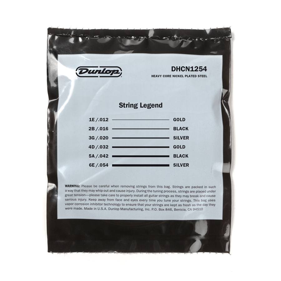 DHCN1254 Heavy Core Nickel Plated Steel è il set di corde 12-54 per chitarra elettrica di casa Dunlop. Queste corde a tensione Heaviest rivestite in nichel sono state progettate in modo da mantenere la giusta sonorità con accordature basse.