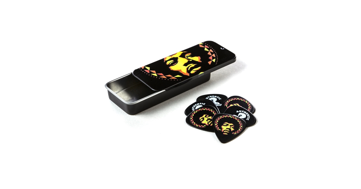 Cinquant'anni fa, Jimi Hendrix ha chiuso un festival storico con un epico set di due ore che includeva la sua famosa interpretazione psichedelica dell'inno nazionale. Queste Pick Tin commemorative ricordano questo importante evento con 6 plettri in Genuine Celluloid impreziositi da opere d'arte del pluripremiato design ILOVEDUST.