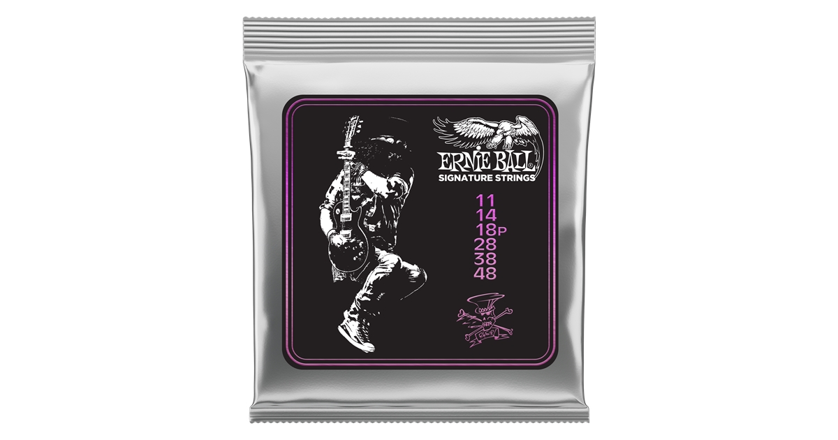 Ernie Ball introduce un set in edizione limitata di corde Slinky firmate da Slash con avvolgimento personalizzato. Questo nuovo set è il culmine di oltre tre decenni di ricerca continua di Slash ed Ernie Ball per creare corde che forniscano maggiore durata e stabilità di accordatura senza sacrificare il timbro e il feeling. Si basano su una scalatura 11-48, la preferita di Slash, con nucleo centrale Paradigm Plasma potenziato, rivestito in acciaio nichelato; le corde lisce, sempre Paradigm, sono costruite con un filo di ottone, rinforzato su ciascuna delle estremità a sfera, per una migliore stabilità e resistenza dell'accordatura. Lo Slash Signature Strings Set viene venduto su una scatola di latta con loghi Ernie Ball e disegni che richiamano Slash e contiene tre confezioni di corde.