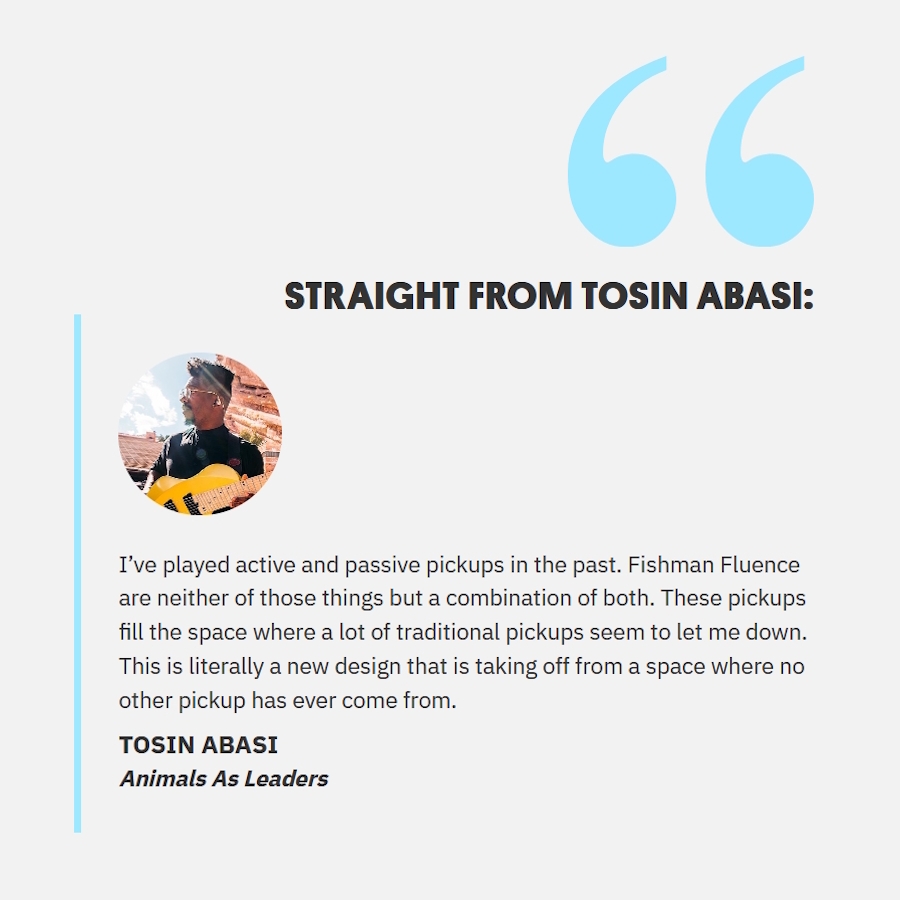 Fluence Tosin Abasi Black Plastic di Fishman è il set di 2 pickup con il più vario mix di suoni di qualsiasi altro pickup della serie Fluence. I timbri sonori di Abasi sfidano da sempre ogni convenzione musicale e solo grazie ai pickup Fluence le idee dell' artista hanno preso forma. Il Set signature Tosin Abasi è unico nel modo in cui mette a disposizione più combinazioni di coil. il set include: 1 pickup ceramico (posizione ponte), 1 pickup alnico (posizione manico o centrale), tutti i componenti necessari per ottenere lo schema di cablaggio di Tosin (selettore pickup negativo), potenziometri volume e tono, push-pull Voice Selector pot per l'utilizzo in posizione volume o tono e tutto il cablaggio richiesto per l'installazione. Disponibile nella versione a 6, 7 o 8 corde.