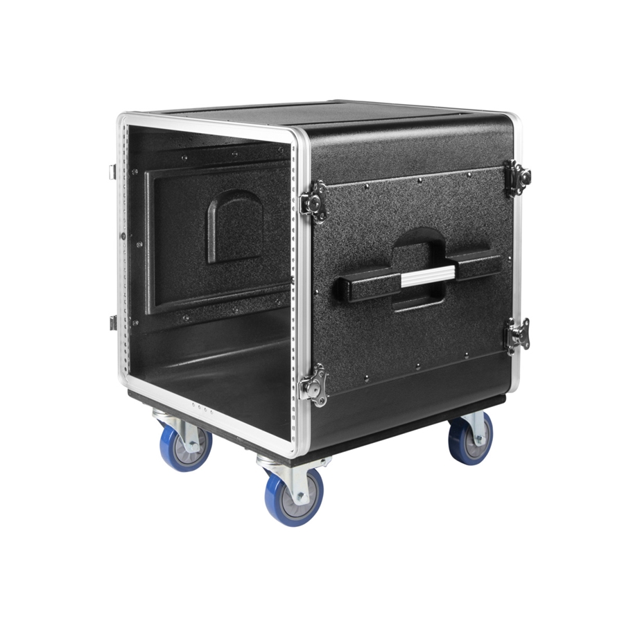 La Gator GRC-BASE-10 è progettata per posizionare comodamente il proprio sistema rack sul palco o in studio, grazie alle quattro rotelle di cui due bloccabili. La costruzione leggera in polietilene protegge l'attrezzatura senza appesantire il sistema, e le maniglie laterali incassate permettono di trasportare la custodia agevolmente. Questa custodia può ospitare fino a 10 unità rack di dimensioni standard con profondità massima di 21" (53.34 cm).