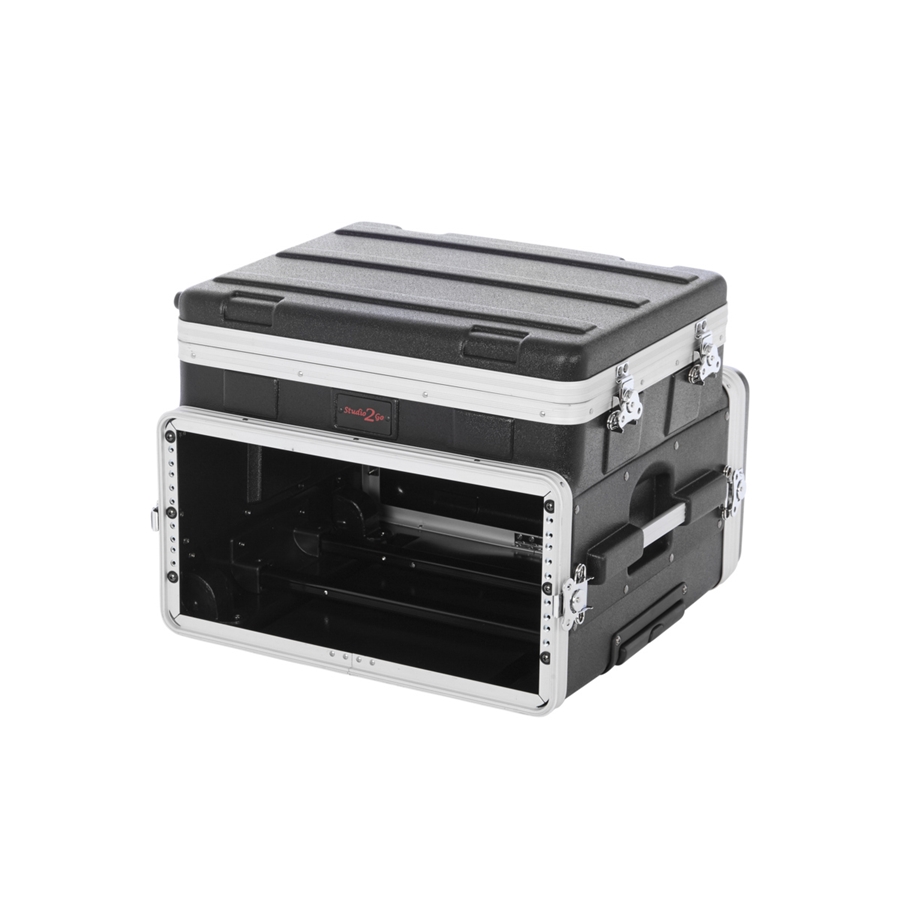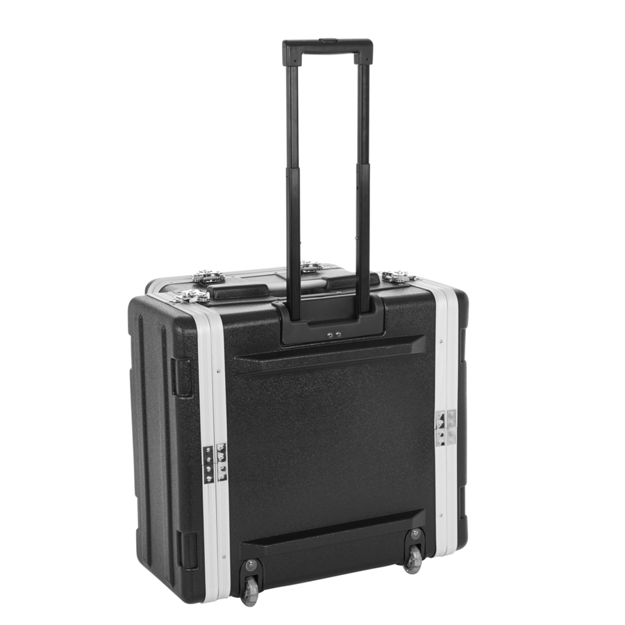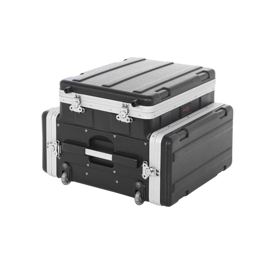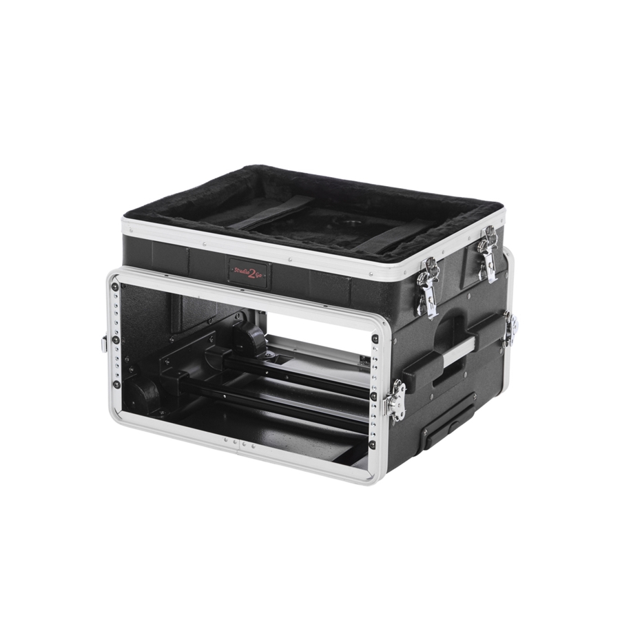 La GRC-STUDIO4GO-W è la custodia di casa Gator progettata per ospitare 4 unità rack più un laptop o un mixer nella parte superiore. La struttura in polietilene è resistente e leggera, e le ruote e la maniglia retrattile consentono un pratico trasporto. La parte superiore presenta delle cinghie per mantenere in posizione il laptop e l'interno in schiuma lo tiene al riparo dai graffi.