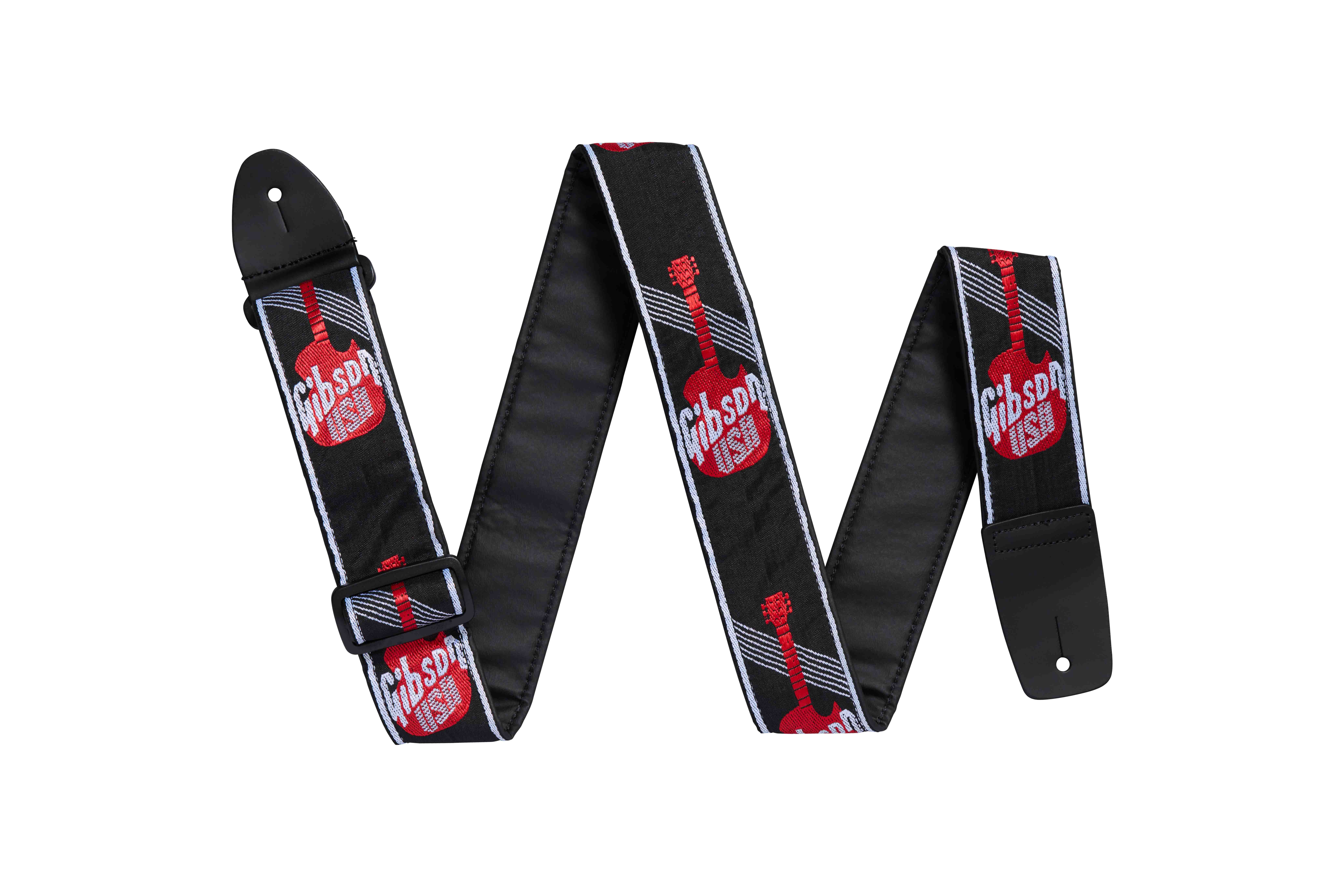 Questa tracolla per chitarra in tessuto di alta qualità ha una larghezza di 5 cm. Presenta i loghi vintage Gibson USA posizionati sull'inconfondibile silhouette di una chitarra Les Paul Standard.