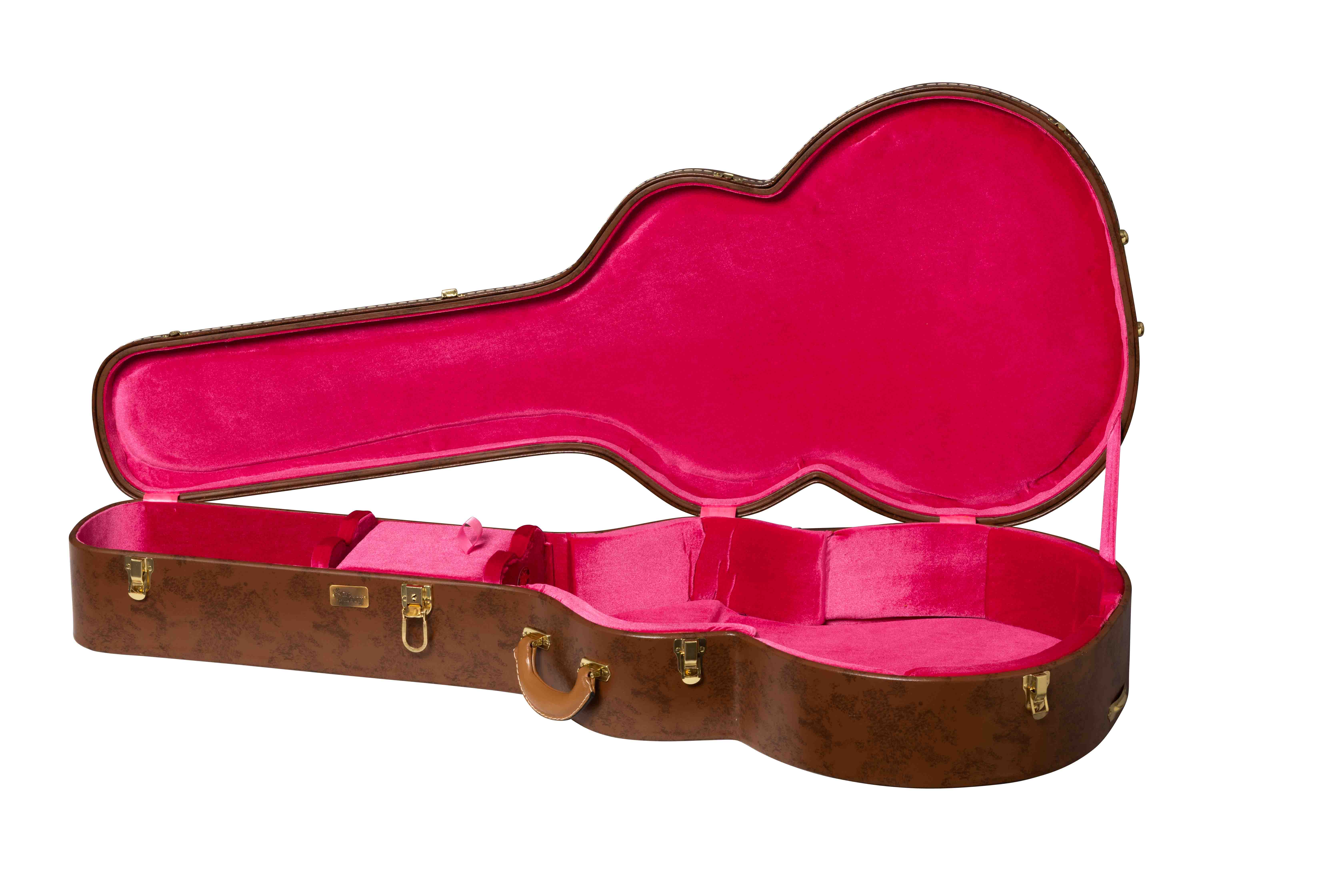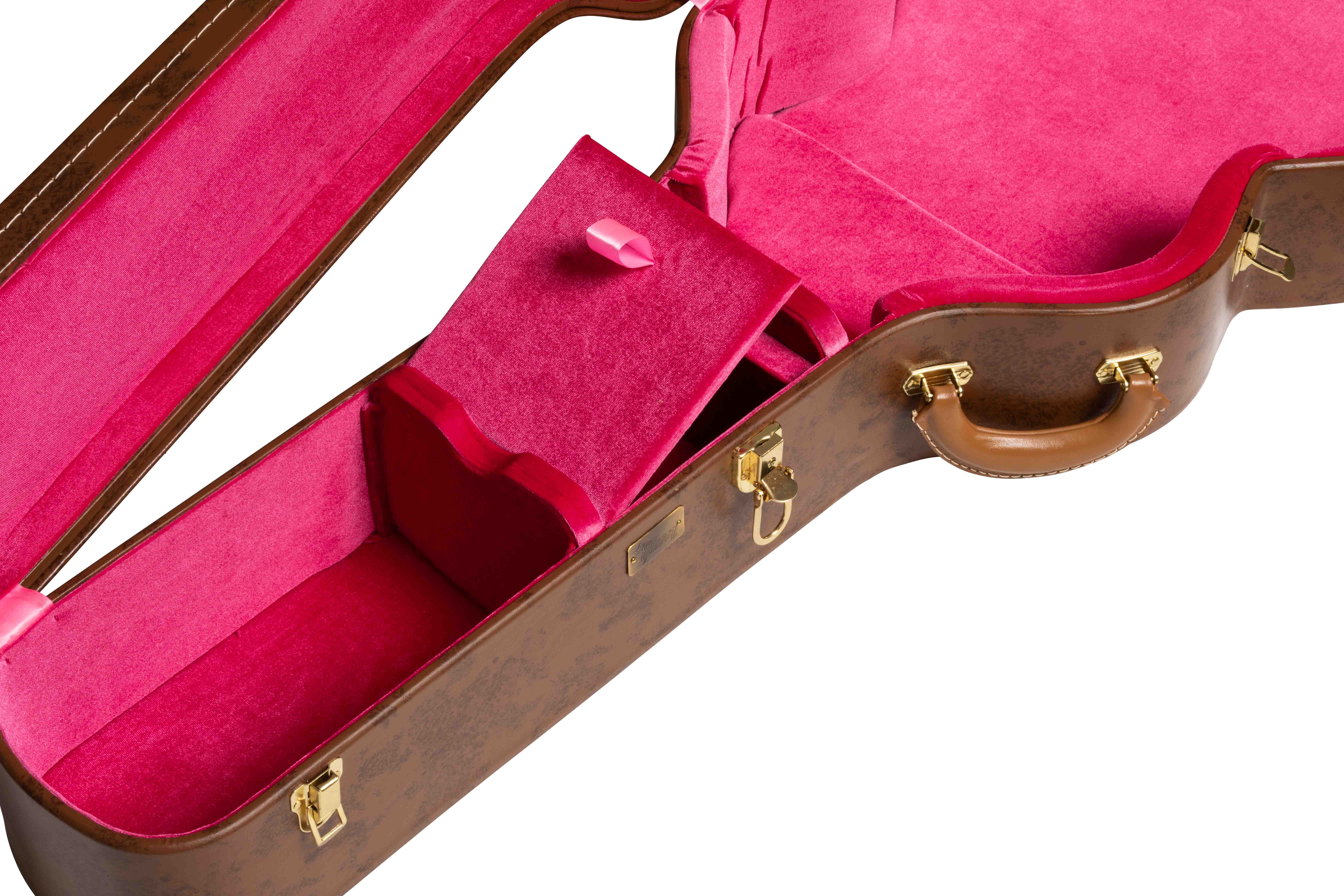 La ASLFTCASE-5L-J200 Lifton Historic Hardshell Case SJ-200 è la custodia rigida sagomata per chitarra acustica di Gibson Accessories, progettata per il modello SJ-200 degli anni '50, ma compatibile con la maggior parte dei modelli J-200. Presenta un elegante esterno in tolex marrone a chiazze con interno in tessuto morbido di colore rosa e cerniere nello stesso stile delle originali degli anni '50 e '60. Colorazione Brown/Pink.