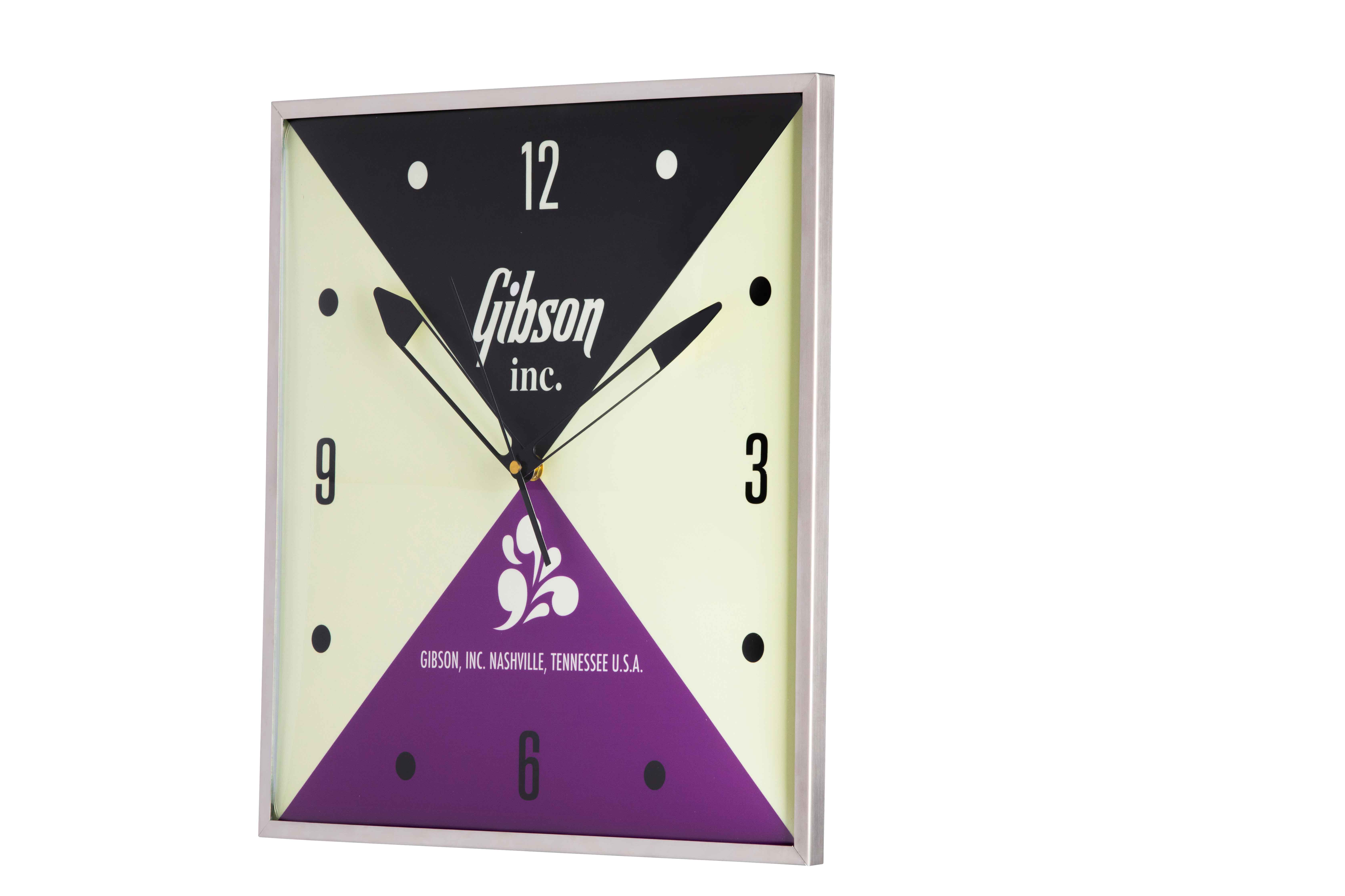Questo orologio da parete realizzato dalla Pam Clock Company quadrato è assemblato negli Stati Uniti, perfetto per arredare la casa, l'ufficio o lo studio. Decorato con i loghi Gibson e "Splash", aggiunge un tocco vintage all'arredamento. È retroilluminato con luci LED vintage di colore arancione scuro ed è realizzato con una struttura in vetro e alluminio. Ha un movimento continuo al quarzo alimentato da una batteria AA (non inclusa). Adattatore di alimentazione internazionale incluso. Dimensioni 37.78 cm x 37.78 cm.