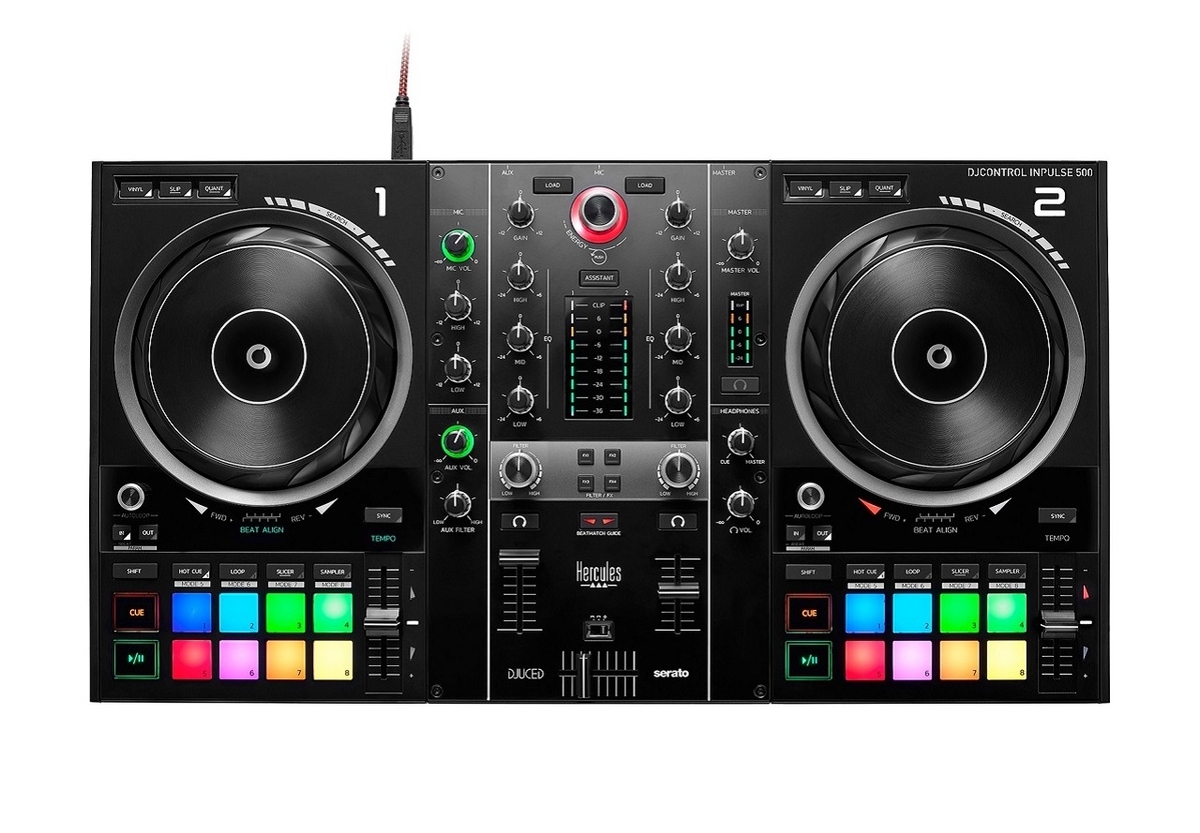 Hercules DJControl Inpulse 500 è il nuovo controller DJ che soddisfa la tua ambizione. Creato per Serato DJ Lite e DJUCED per aiutarti a iniziare a mixare come un DJ, migliorare le tue abilità e esibirti davanti ad un pubblico, DJControl Inpulse 500 ha un design professionale con una robusta placca metallica protettiva ed un sacco di funzioni eccezionali: quattro piedini estendibili/retrattili per sollevare il tuo mixaggio, un mixer hardware per gli ingressi audio, un'area dedicata Filter/FX con fantastici effetti, due ampie manopole jog sensibili al tocco per lo scratching, 16 pad RGB in gomma retroilluminati, utili guide luminose per mixare in totale fiducia...e molto altro ancora. Puoi persino mixare utilizzando i milioni di brani dei servizi di musica in streaming, tra cui TIDAL e SoundCloud GO+ in Serato DJ Lite, e Beatport LINK, Beatsource LINK e Qobuz in DJUCED. L'area Filter/FX ti permette di personalizzare il tuo DJ set con gli effetti disponibili in Serato DJ Lite e DJUCED. Puoi persino combinare l'azione del filtro con un effetto, in DJUCED. La manopola AUX Filter ti permette di aggiungere un effetto filtro ad una sorgente audio esterna (smartphone, lettore multimediale) indipendentemente dal software. A piedini aperti, il DJControl Inpulse 500 è alto 8cm. Puoi far passare i cavi sotto e protegge il controller dai drink rovesciati. A piedini aperti (ossia estesi), la base è retroilluminata. Alimentato tramite USB, il DJControl Inpulse 500 dispone delle uscite master di cui hai bisogno per collegare i tuoi altoparlanti (2 jack da 6,35mm + 2 RCA), oltre a due connettori per cuffie (mini-jack stereo da 3,5mm + jack stereo da 6,35mm). È facile mixare manualmente un brano con l’altro, grazie alle guide luminose BEATMATCH GUIDE, supportate sia in DJUCED che in Serato DJ Lite. Collega il tuo microfono all’ingresso bilanciato e regola la tua voce utilizzando le manopole High EQ e Low EQ, per poterla ascoltare distintamente mentre ti stai esibendo. L'Intelligent Music Assistant (IMA) di DJUCED ti suggerisce i brani più adatti da mettere in coda, selezionandoli dalla tua libreria musicale, oltre che da Beatport LINK, Beatsource LINK. Attiva l’Assistente per avviare la funzione Autoplay in Serato DJ Lite. Puoi regolare facilmente l'ampiezza del crossfader in base allo stile della tua musica. Usa la funzione curve switch per cambiare la curva del crossfader direttamente dal controller (mix, scratching o disattivata).