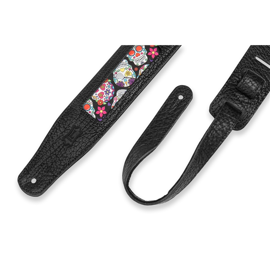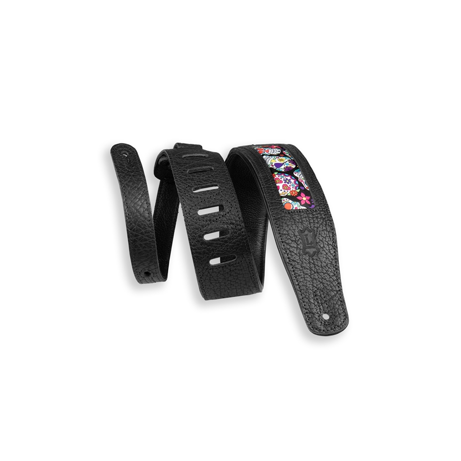 La M26CAL-002 è la tracolla in pelle con finestre con stampa di design Calaca Eyes di casa Levy's. Larghezza 2 1/2" (6.35) cm, regolabile fino a 52" (132 cm). Colorazione Black.
