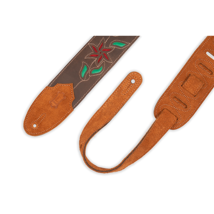 La M4FV-DBR_RED è la tracolla in pelle pieno fiore con retro in pelle di casa Levy's, che presenta un intaglio che lascia intravedere fiori in pelle. Ha una larghezza di 2 1/2" (6.35 cm) ed è regolabile da 47" (119.38 cm) fino a 54" (137.16 cm). Colorazione Brown.