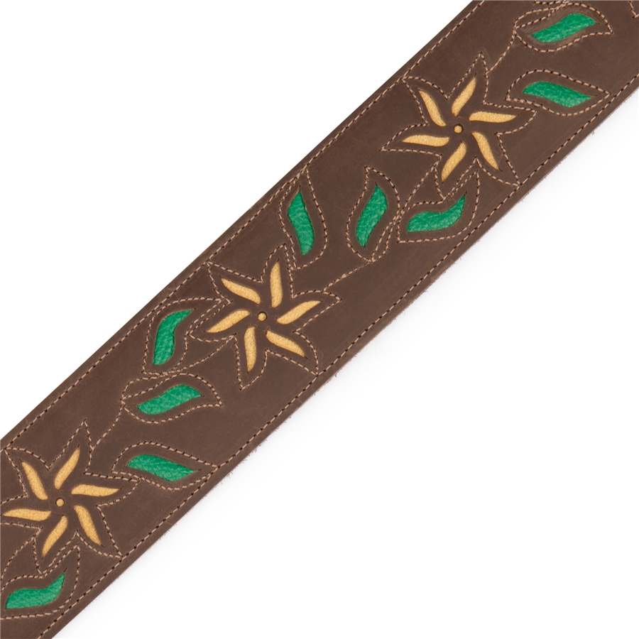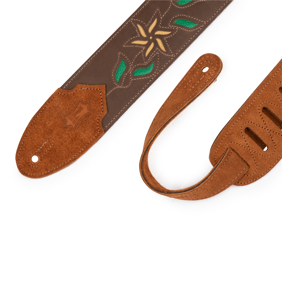 La M4FV-DBR è la tracolla in pelle con retro in pelle di casa Levy's, che presenta un intaglio che lascia intravedere fiori in pelle. Ha una larghezza di 2 1/2" (6.35 cm) ed è regolabile da 47" (119.38 cm) fino a 54" (137.16 cm). Colorazione Brown.