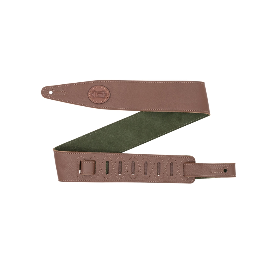 La MGS317ST-BRN-GRN è una tracolla in pelle con retro in pelle scamosciata da 2 1/2" (6.35 cm) di casa Levy's. È regolabile da 48" (121.92 cm) fino a 55" (139.7 cm). Colorazione Brown con retro Olive Green.