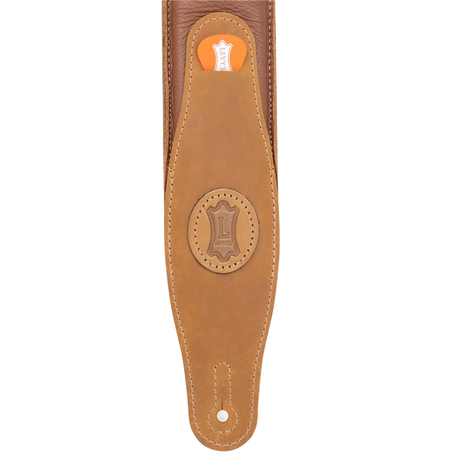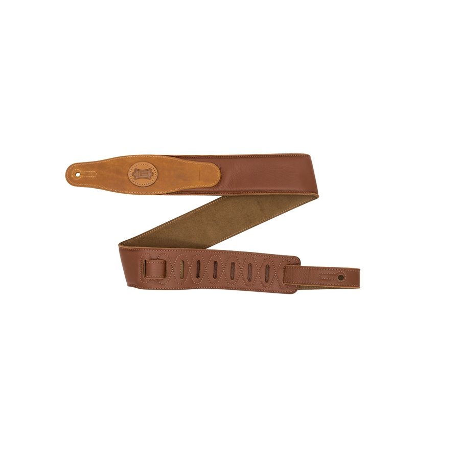 La MGS80CS-TAN-SND è una tracolla in pelle imbottita con retro in pelle scamosciata da 2 1/2" (6.35 cm) di casa Levy's, con porta plettri sul terminale. È regolabile da 48" (121.92 cm) fino a 55" (139.7 cm). Colorazione Tan con retro Sand.