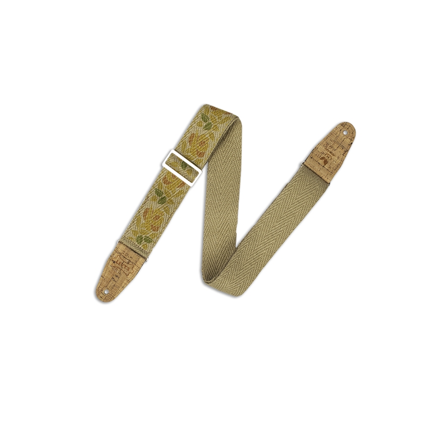 La MH8P-008 è la tracolla in canapa naturale con terminali in sughero a due strati di casa Levy's, larga 2" (5.08 cm) e regolabile fino a 62" (157.48 cm). Stampa Rosa Motif Yellow and Orange.