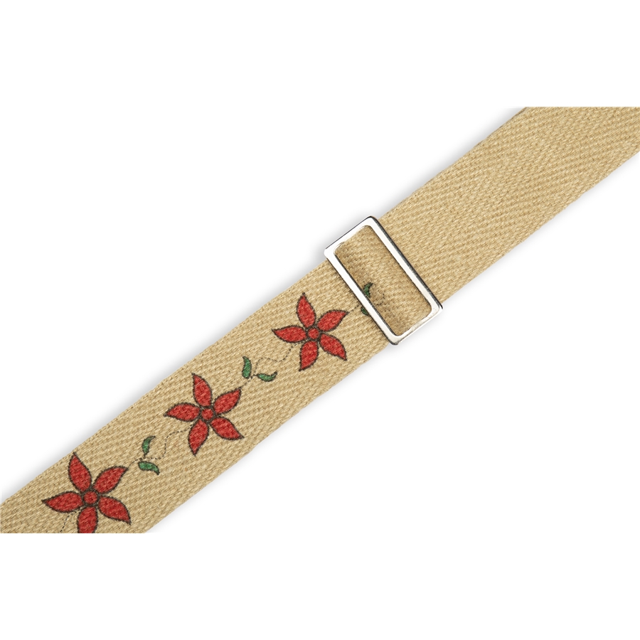 La MH8P-012 è la tracolla in canapa naturale con terminali in sughero a due strati di casa Levy's, larga 2" (5.08 cm) e regolabile fino a 62" (157.48 cm). Stampa Flowering Vines Red Flowers.