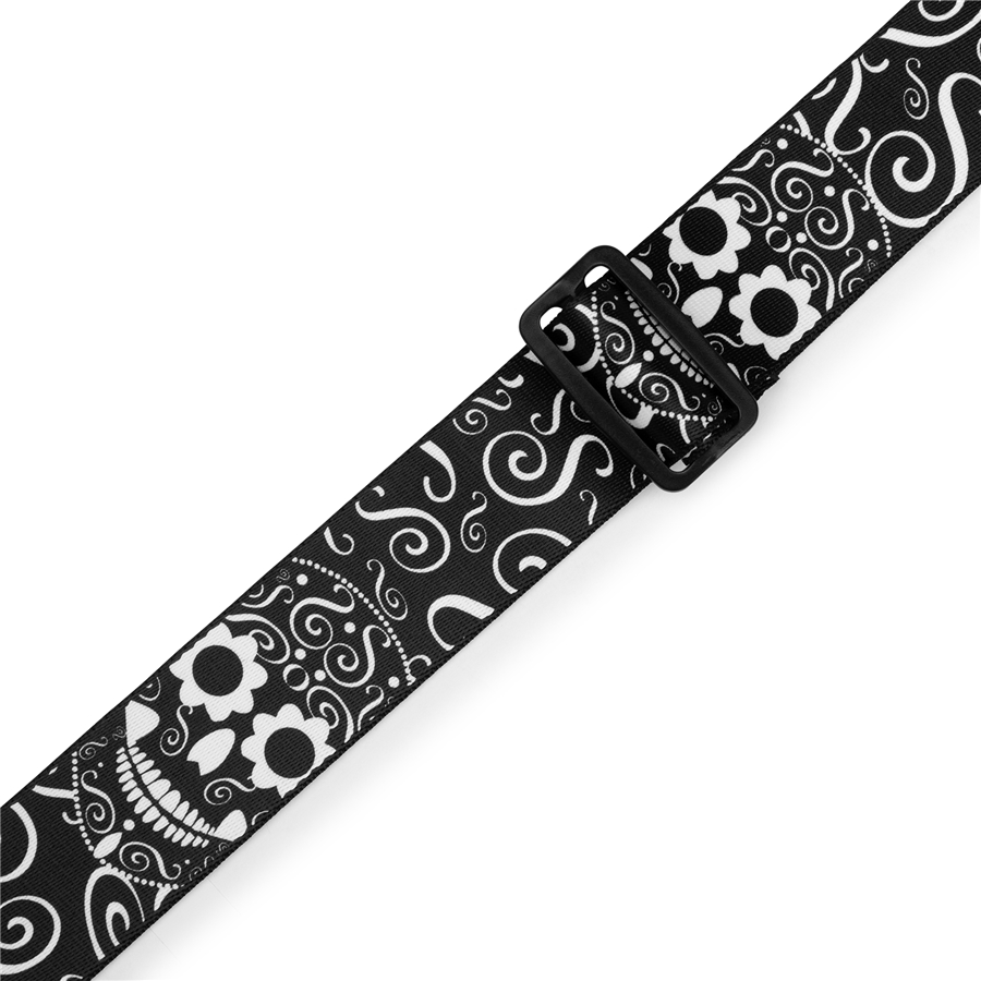 La MP2CAL-003 è la tracolla in poliestere della serie Calaca da 2" (5.08 cm) di casa Levy's. È regolabile fino a 65" (165.1 cm). Stampa Black and White Skull.