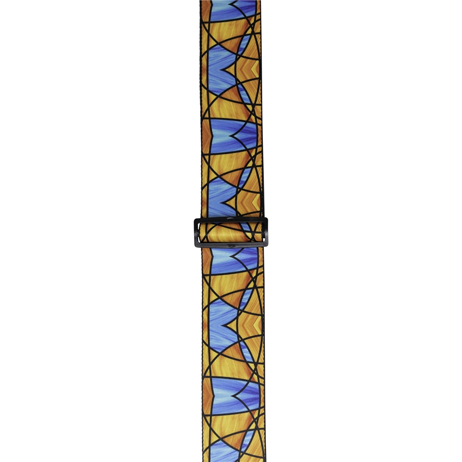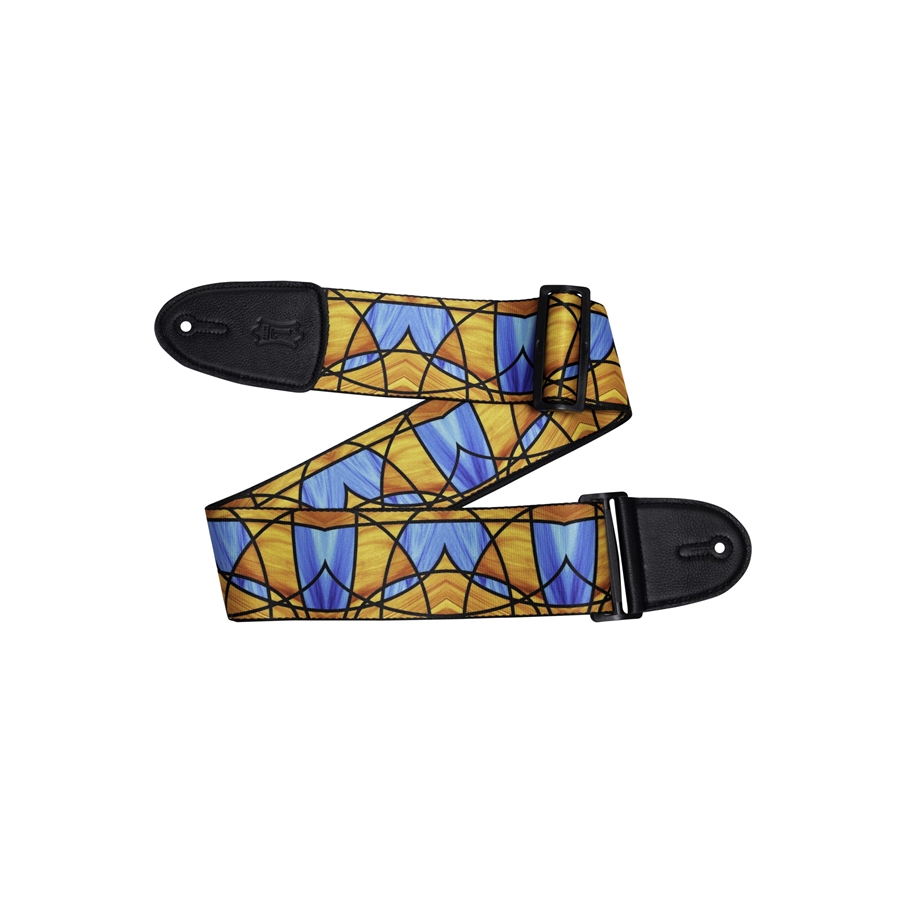 La MP3SG-002 è la tracolla in polipropene da 3" (7.62 cm) di casa Levy's, con stampa Stained Glass Design In Orange and Blue. Regolabile fino a 62" (157.48 cm).