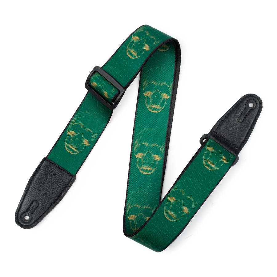 La MPD2-113 è la tracolla in poliestere da 2" (5.08 cm) di casa Levy's, regolabile fino a 59 1/2" (151.13 cm). Stampa Green and Mustard Scanned Skull.