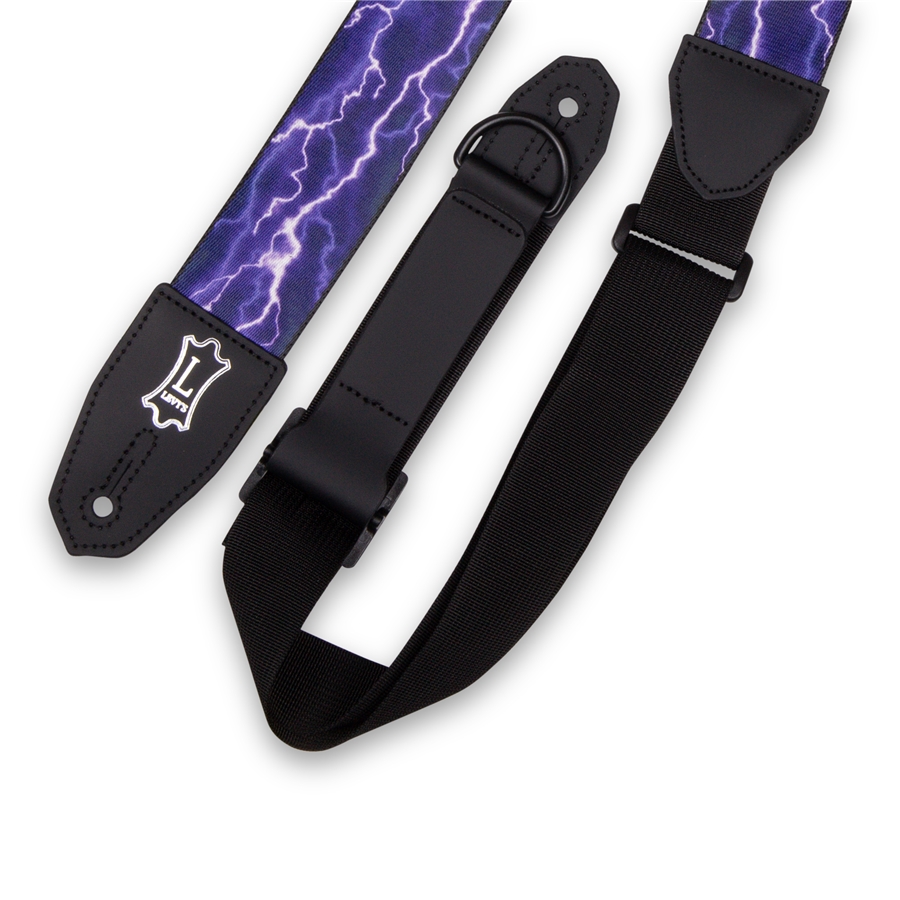 La MPRH-18 è la tracolla in poliestere da 2" (5.08 cm) di casa Levy's, regolabile da 43" (109.22 cm) a 57" (144.78 cm) grazie al sistema di regolazione RipChord. Stampa Lightning.