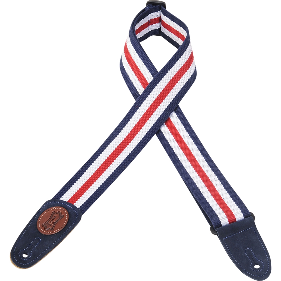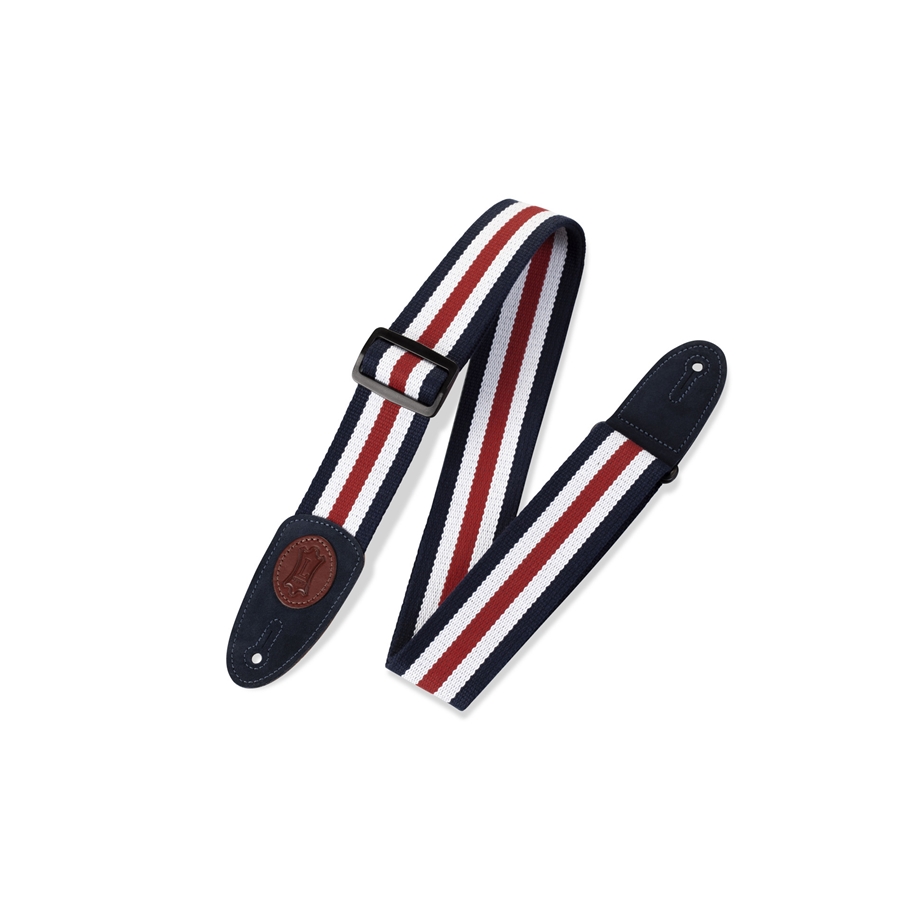 La MSSC8-RWB è una tracolla realizzata in cotone prodotto con tecniche che rispettano l'ambiente. I terminali sono realizzati in pelle scamosciata con l'iconico logo ovale Levy's in pelle, e sono cuciti alla tracolla per aumentarne la robustezza. Ha una larghezza di 2" (5.08 cm), ed è regolabile con sistema Tri-Glide fino a 65" (165.1 cm). Colorazione Red White and Blue a strisce.