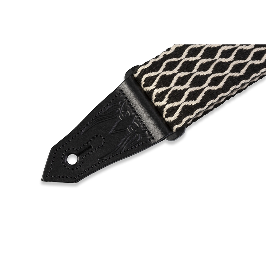 La MSSC80-BLK/WHT è la tracolla in cotone con terminali in pelle conciata al vegetale lavorati di casa Levy's. Ha una larghezza di 2" (5.08 cm) ed è regolabile da 37" (93.98 cm) fino a 63" (160 cm). Colorazione Black and White.