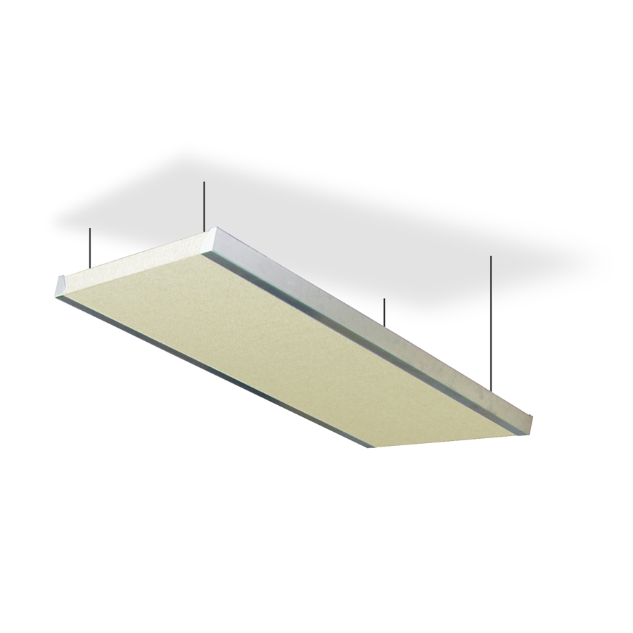 Attraente e molto conveniente, il pannello Stratus viene spedito in kit ed è facilmente assemblabile in pochi minuti utilizzando un semplice cacciavite. Il kit include un pannello acustico da 51mm di spessore realizzato con lana di vetro ad alta densità da 96 kg/m³ e tutto l’hardware necessario alla sospensione sospensione. La lana di vetro è inserita all’interno di una microrete protettiva e i bordi sono resinati per trattenere il più possibile le fuoriusite di fibra di vetro (non tossica). Per migliorare la resa estetica, il pannello è ricoperto da un tessuto acusticamente trasparente di colore Nero.
