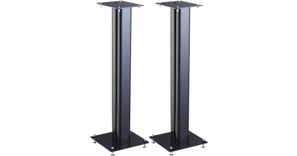 Coppia di supporti per monitor audio ad altezza fissa composti da due solidi profilati verticali in acciaio.
