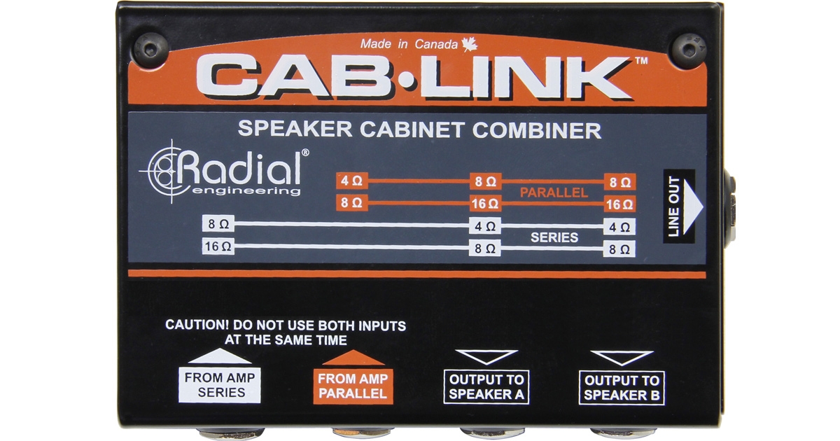Radial Cab-Link è uno Speaker Cabinet Merger passivo, un dispositivo compatto che offre la soluzione ideale per collegare contemporaneamente due cabinet, su amplificatori che dispongono di un'unica uscita Speaker. Cab-Link permette configurazioni sia in serie che in parallelo, è realizzato con elettronica passiva che non richiede alimentazione, e dispone inoltre di uscita Linea con controllo di livello.