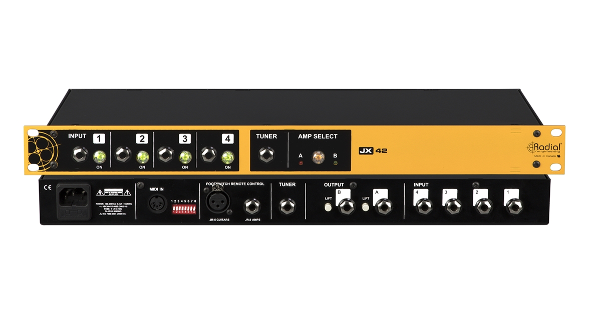 JX42 V2 di Radial Engineer è un selettore per chitarra e amplificatori che gestisce fino a quattro strumenti e due ampli contemporaneamente. Realizzato con componenti di alta qualità, offre audio professionale e supporta pedali Radial e controller MIDI per il controllo remoto.