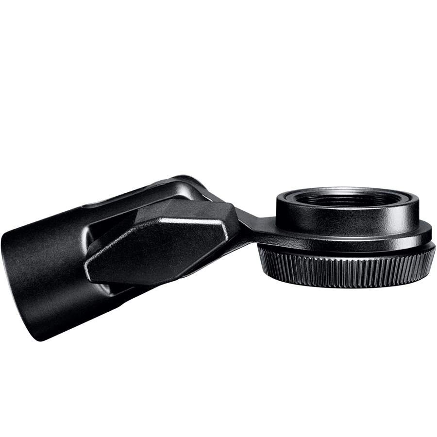 Supporto snodato per asta microfonica, che fissa in modo sicuro i microfoni Shure con diaframma largo a ripresa laterale: KSM27, KSM32, KSM44 e SM27 di Shure. Colore nero.