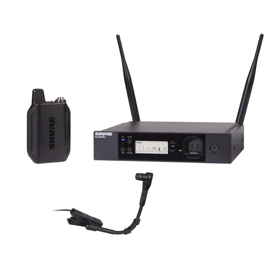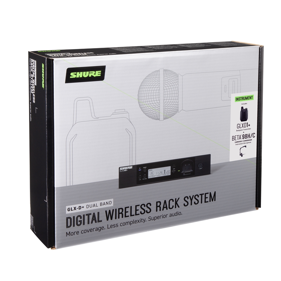 Sistema a rack wireless completo Shure GLX-D+ per la ripresa microfonica di strumenti musicali quali ottoni e percussioni, dotato di microfono che si può fissare al bordo del fusto di un tamburo (rullante, tom) oppure sull'apertura di uno strumento a fiato. Sfrutta la tecnologia Dual Band (2.4GHz e 5.8GHz) e include il microfono cardioide a condensatore a collo d'oca flessibile BETA®98H, il trasmettitore bodypack GLXD1+ e il ricevitore GLXD4R+ a mezza unità rack. La perfetta combinazione della gestione automatica delle frequenze con la tecnologia a doppia banda (2.4GHz e 5.8GHz) garantisce prestazioni affidabili e coerenti. Le batterie ricaricabili al litio proprietarie di Shure offrono fino a 12 ore di utilizzo.