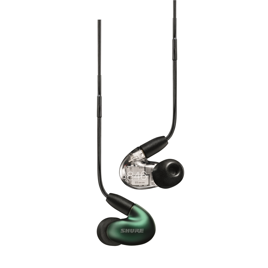 Auricolari professionali di fascia alta Shure 846 Gen 2 nella versione color Verde Giada con cavo di comunicazione dotato microfono e controlli per chiamate e riproduzione musicale.