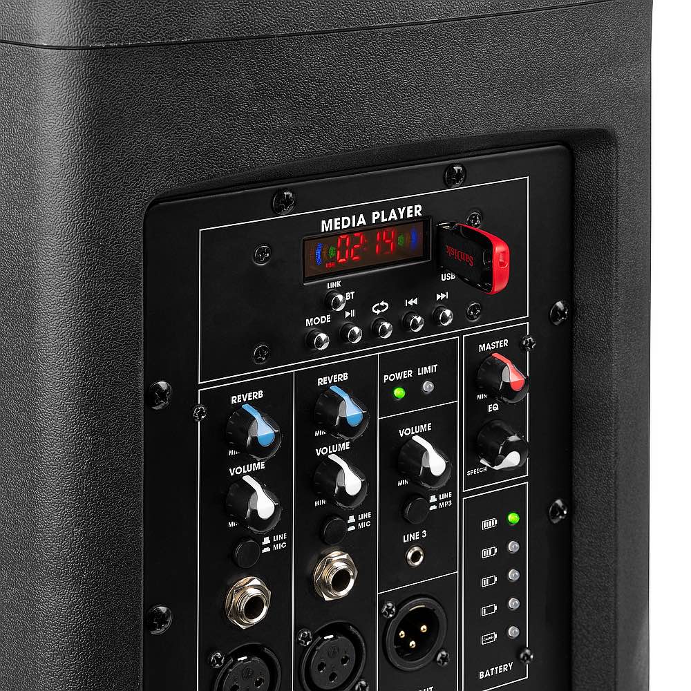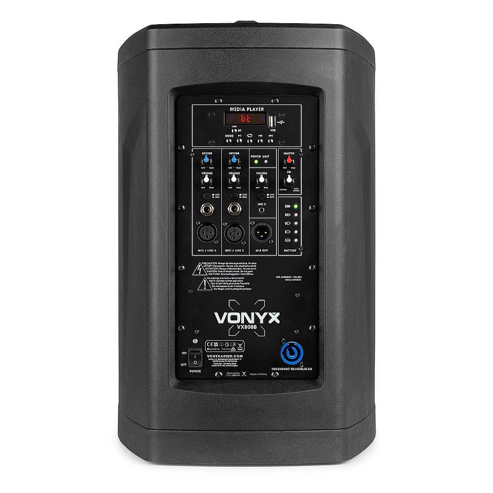 <p>La serie Vonyx VX è una gamma di sistemi di altoparlanti a colonna Plug and Play compatti progettati per offrire un suono potente e di alta qualità con dispersione ottimizzata. Dotata della tecnologia BT 5.0, la serie VX consente uno streaming wireless senza interruzioni, rendendola perfetta per la riproduzione musicale, presentazioni e spettacoli dal vivo. Ogni modello della serie presenta un design leggero, un DSP integrato, una varietà di ingressi, un amplificatore in classe D e un mixer per un facile controllo. Grazie all'intelligente sistema di aggancio gli altoparlanti sono facili da trasportare e da montare in un batter d'occhio. La serie VX è la scelta perfetta per chi ha bisogno di un suono professionale in movimento!</p><ul><li>Sistema di altoparlanti a colonna bi-amplificati da 320W</li><li>Batteria integrata agli ioni di litio (11,1 V/8 A)</li><li>Fino a 10 ore di durata della batteria</li><li>Modulo di riproduzione multimediale USB con display</li><li>Ricevitore BT 5.0 per streaming audio wireless</li><li>Accoppiamento stereo (collegamento ad altri VX808)</li><li>Efficiente amplificatore in classe D</li><li>Altoparlante a colonna: 4x 2,75″ medio/alto</li><li>Woofer: 8″</li><li>Ingresso linea Ch1 e Ch2: XLR / Jack 6,3mm</li><li>Ingresso linea su Ch3: Jack da 3,5 mm</li><li>Uscita linea XLR</li><li>Ingressi linea/microfono e linea/Mp3 commutabili</li><li>Controllo alti/bassi/echo</li><li>Leggero quindi facile da trasportare</li></ul><ul><li>Product colour Black</li><li>Playback options BT 5.0 streaming, USB, Line input, Microphone (input)</li><li>Input connections 3.5mm Jack, 6.3mm Jack, USB, XLR (3-pin)</li><li>Output connections XLR (3-pin)</li><li>Output power: Max 320W</li><li>Output power: RMS 160W</li><li>Tweeter type Cone</li><li>Diameter tweeter 2.75″</li><li>Diameter woofer 8″</li><li>Voice coil 30mm</li><li>Magnet type Ferrite</li><li>Frequency response 45Hz - 20.000Hz</li><li>Impedance 2 Ohm</li><li>SPL @ 1W/1m 90dB</li><li>SPL max 116dB</li><li>Power supply 100-240VAC 50/60Hz</li><li>Dimensions (L x W x H) 380 x 310 x 1860mm</li><li>Weight (kg) 14,60</li><li>Included accessories Power cable</li></ul>